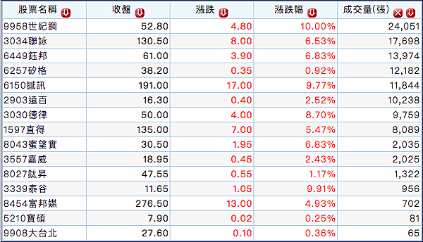 憾訊(161%)、世紀鋼、點晶、嘉威、泰谷、直得、華韡、亞獅康-KY、牧德、富驛-KY(+50%)