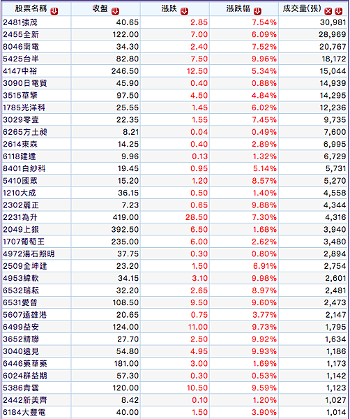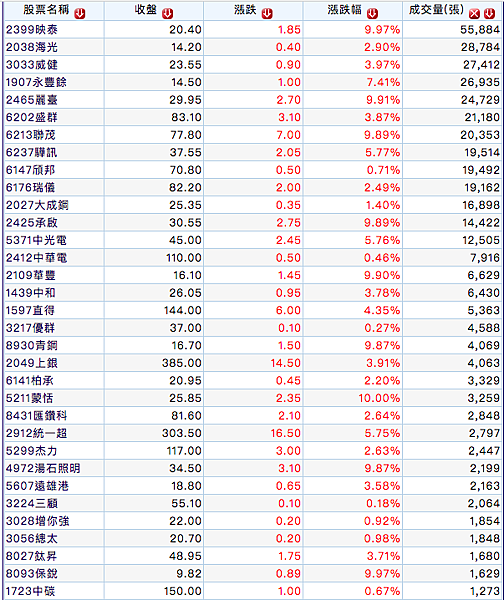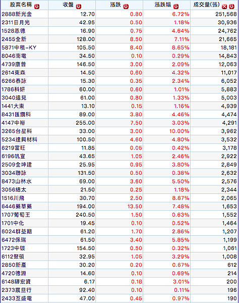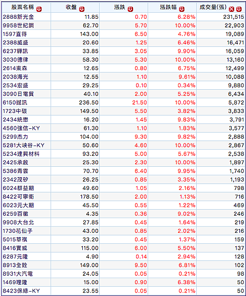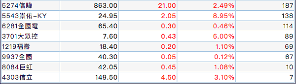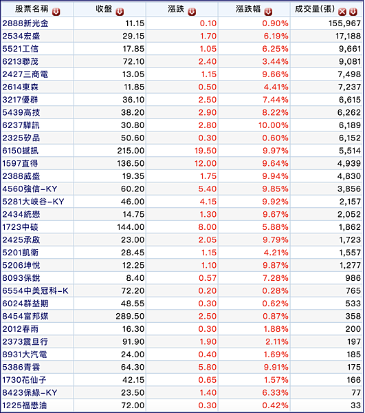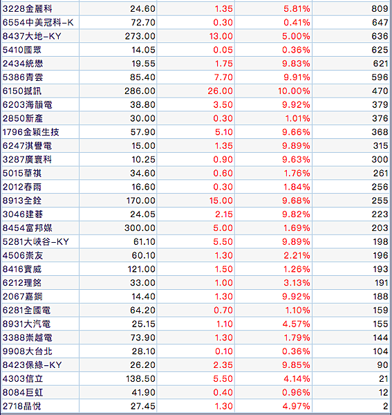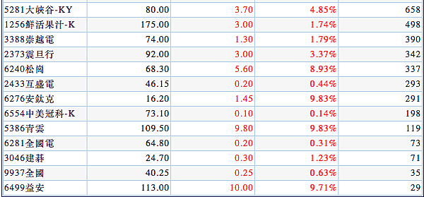憾訊(325%)、青雲、世紀鋼、松崗、保銳、威盛、承啟、大峽谷-KY、點晶、金麗科(+97%)