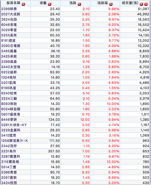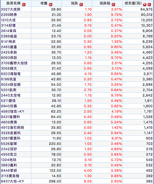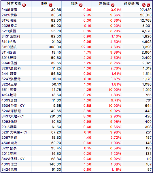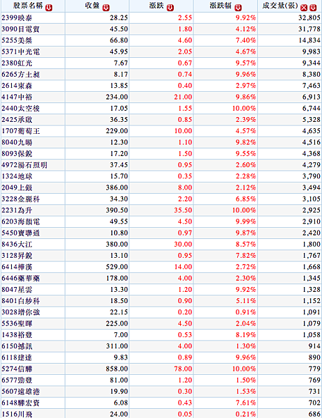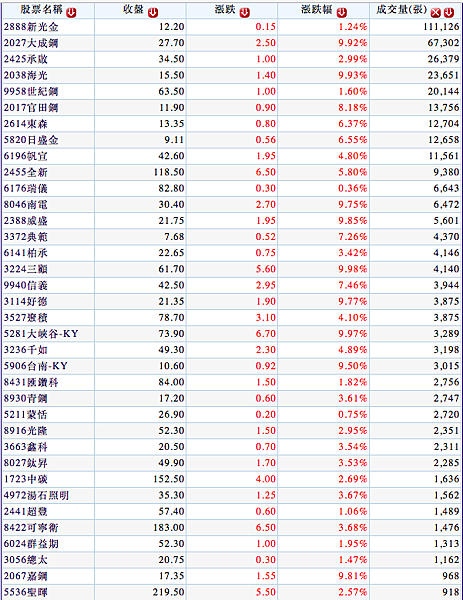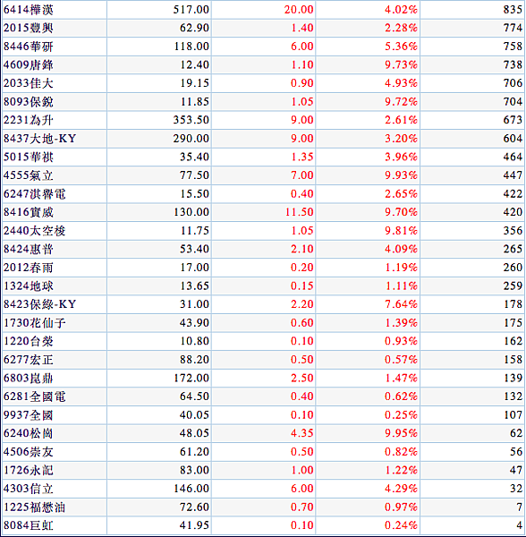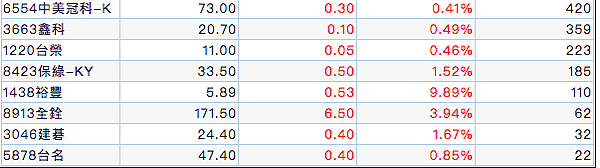 憾訊(325%)、青雲、松崗、世紀鋼、保銳、承啟、大峽谷-KY、威盛、映泰、點晶(+102%)